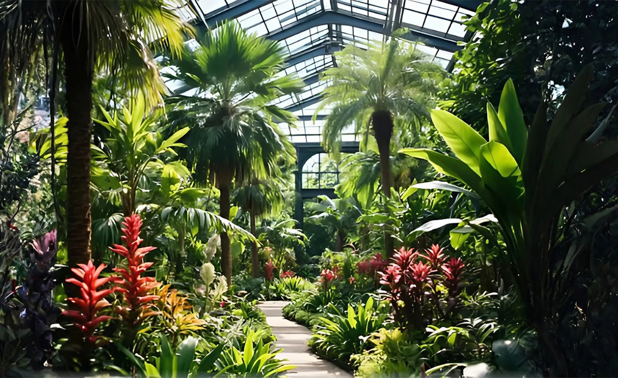 - Экспозиции закрытого грунта размещаются на грунтовых площадках в шести отделениях фондовой оранжереи, пять из которых имитируют типичные растительные формации тропиков и субтропиков: «Влажные тропики», «Сухие тропики», «Эпифиты», «Кактусы и суккуленты».