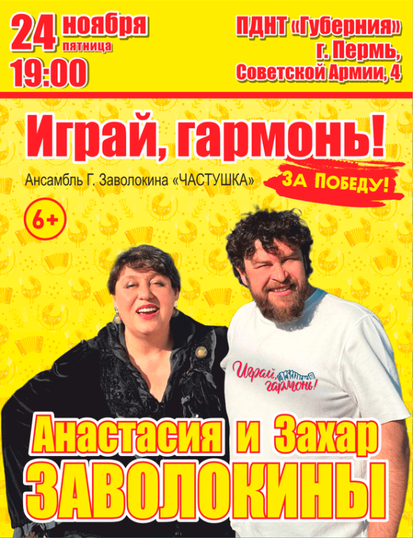 24 ноября в 19-00 в ПДНТ «Губерния» состоится концерт ансамбля «Частушка» с участием ведущих Первого канала Анастасии и Захара Заволокиных!