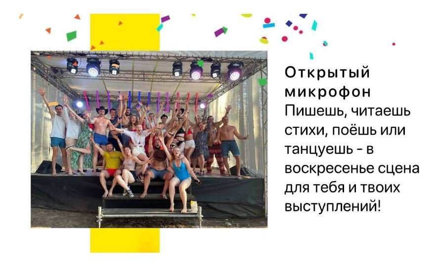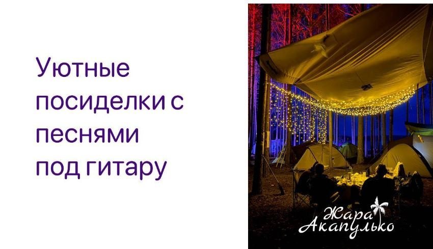 Как всегда на Жаре в Акапулько вас ждёт: сцена, 10 Квт звука, клубный свет, пляжный волейбол, футбол, катанье на каяках и сапах, возможность раскрыть свой талант в формате открытый микрофон, песни под гитару ночью у костра, коллективная зарядка, йога и групповые медитации, тематические конкурсы и мастер-классы и детская программа с аниматорами.